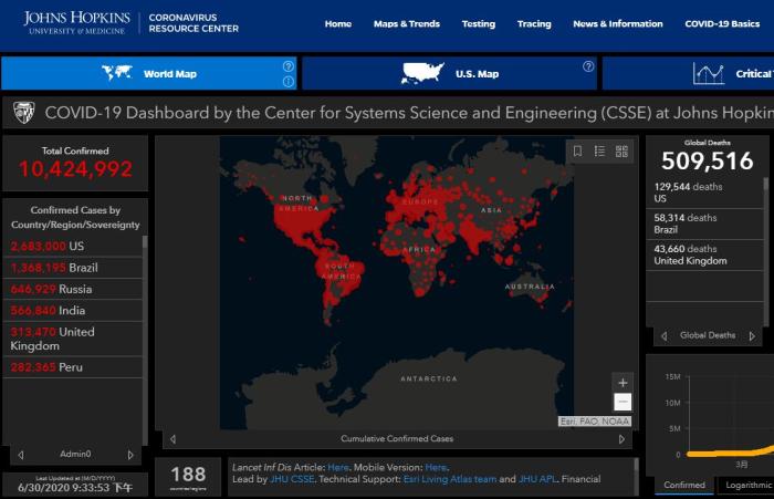 中新网6月30日电 综合报道,美国约翰斯·霍普金斯大学实时统计数据显示,截至北京时间6月30日21时33分许,全球新冠确诊病例已超1042万,累计死亡超50.9万。新冠疫情持续蔓延数月,数据显示美国近一半人处于无业状态,日本失业率大增,许多国家经济活动陷入停滞。另一方面,多国旅游业7月起逐渐重启,应对疫情“新常态”的挑战。