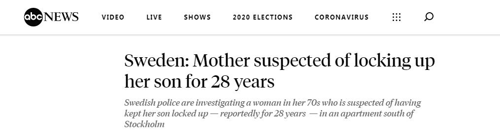 【环球网报道 见习记者 边子豪】据美国广播公司(ABC)报道,瑞典斯德哥尔摩警方正在调查一起非法囚禁案件。报道称,一位七十多岁母亲涉嫌囚禁其儿子长达28年。