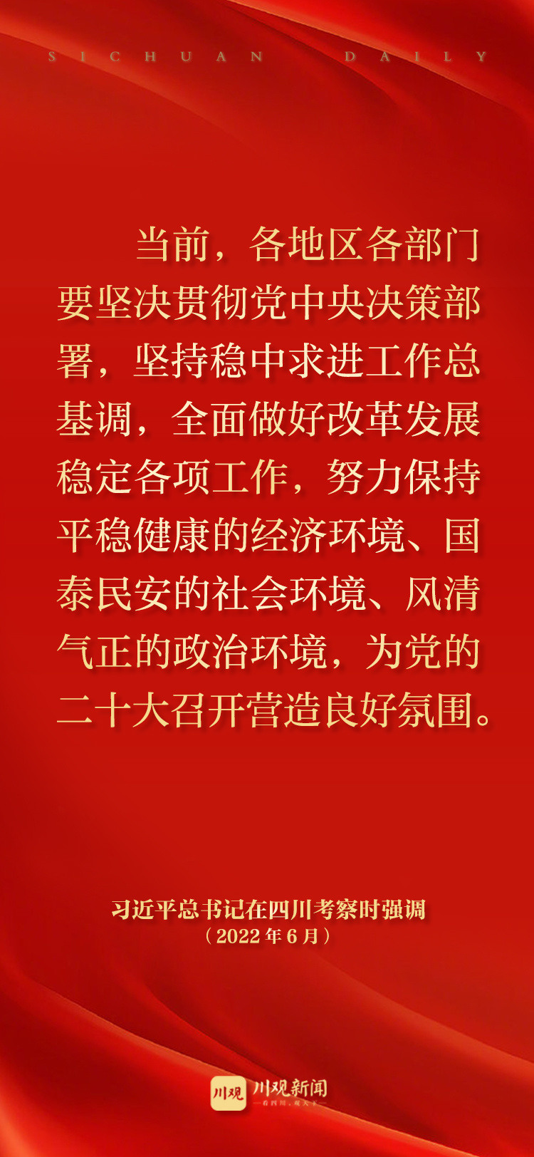 中共中央总书记、国家主席、中央军委主席习近平近日在四川考察时强调,要坚决贯彻党中央决策部署,弘扬伟大建党精神,坚持稳中求进工作总基调,完整、准确、全面贯彻新发展理念,主动服务和融入新发展格局,统筹疫情防控和经济社会发展,保持经济稳定发展,保持社会大局稳定,推动治蜀兴川再上新台阶,在全面建设社会主义现代化国家新征程上奋力谱写四川发展新篇章,以实际行动迎接党的二十大胜利召开。