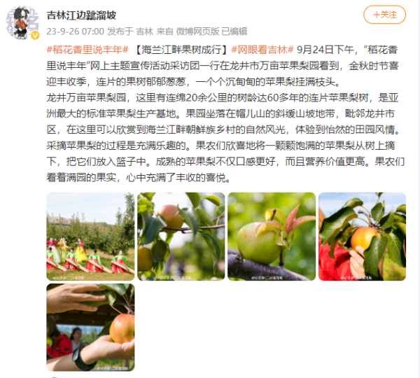 9月26日,由中央网信办网络传播局指导,吉林、辽宁、黑龙江、河南、四川等地省委网信办主办,吉林省互联网传媒股份有限公司(中国吉林网)承办的“稻花香里说丰年”网上主题宣传活动进入第四天。