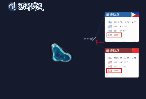 2月18日,菲1架C-208型机非法闯入中国黄岩岛领空,多次擅自改变飞行高度,218秒降高920米,以不专业、危险方式,蓄意近距穿越我在空正常巡逻直升机高度层,极易引发海空不测事件。